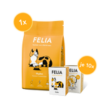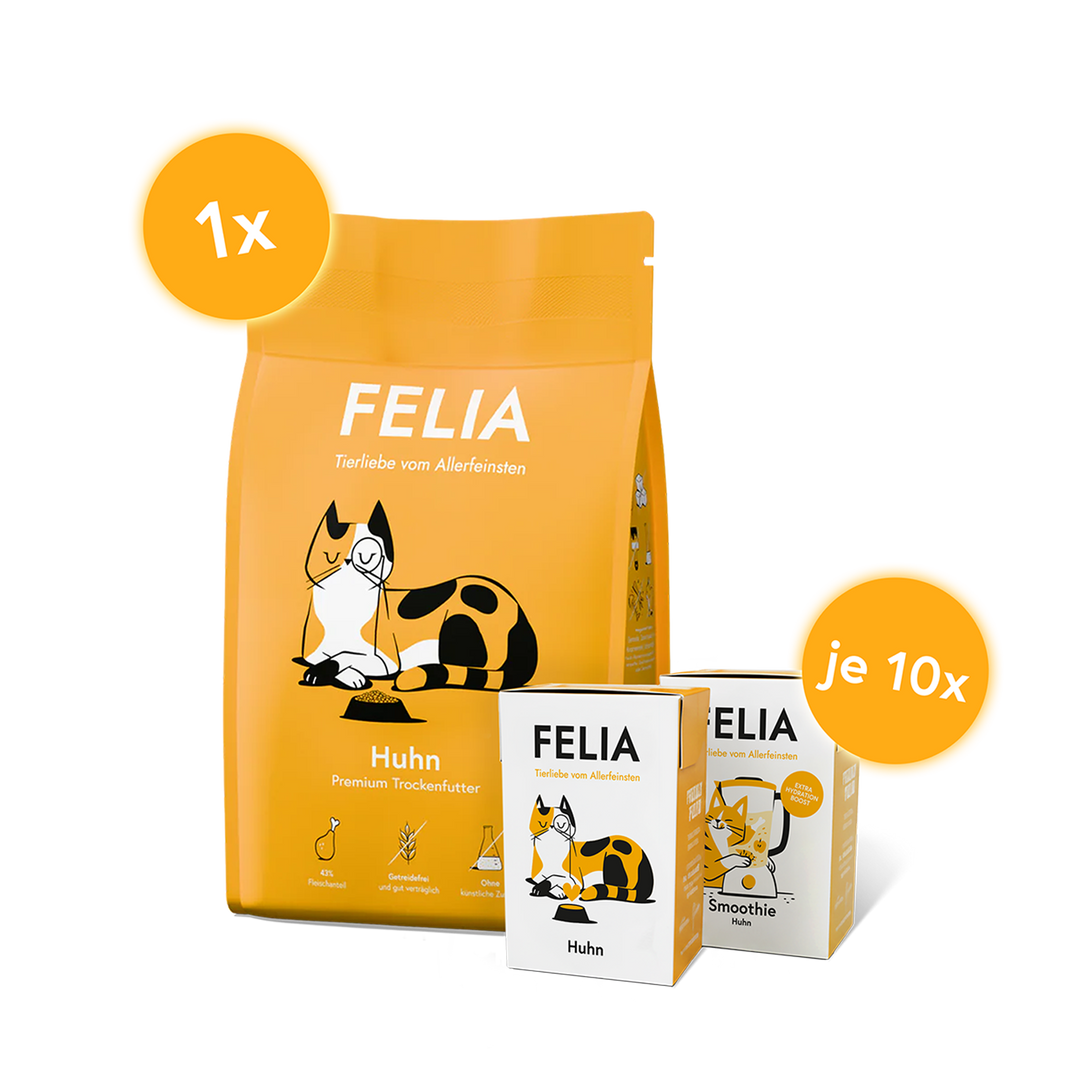 Unser FELIA Premium Trockenfutter Huhn bietet eine hochwertige, gut verdauliche Rezeptur mit viel frischem Fleisch und optimalem Nährstoffprofil. Dazu kommen 10 Dosen unseres beliebten FELIA Huhn Nassfutters – vollfleischig, saftig und ideal für tägliche Genussmomente. Abgerundet wird das Paket durch 10 × FELIA Smoothie Huhn, die als Topping, Schlecksnack oder zur Futteraufwertung perfekt geeignet sind.