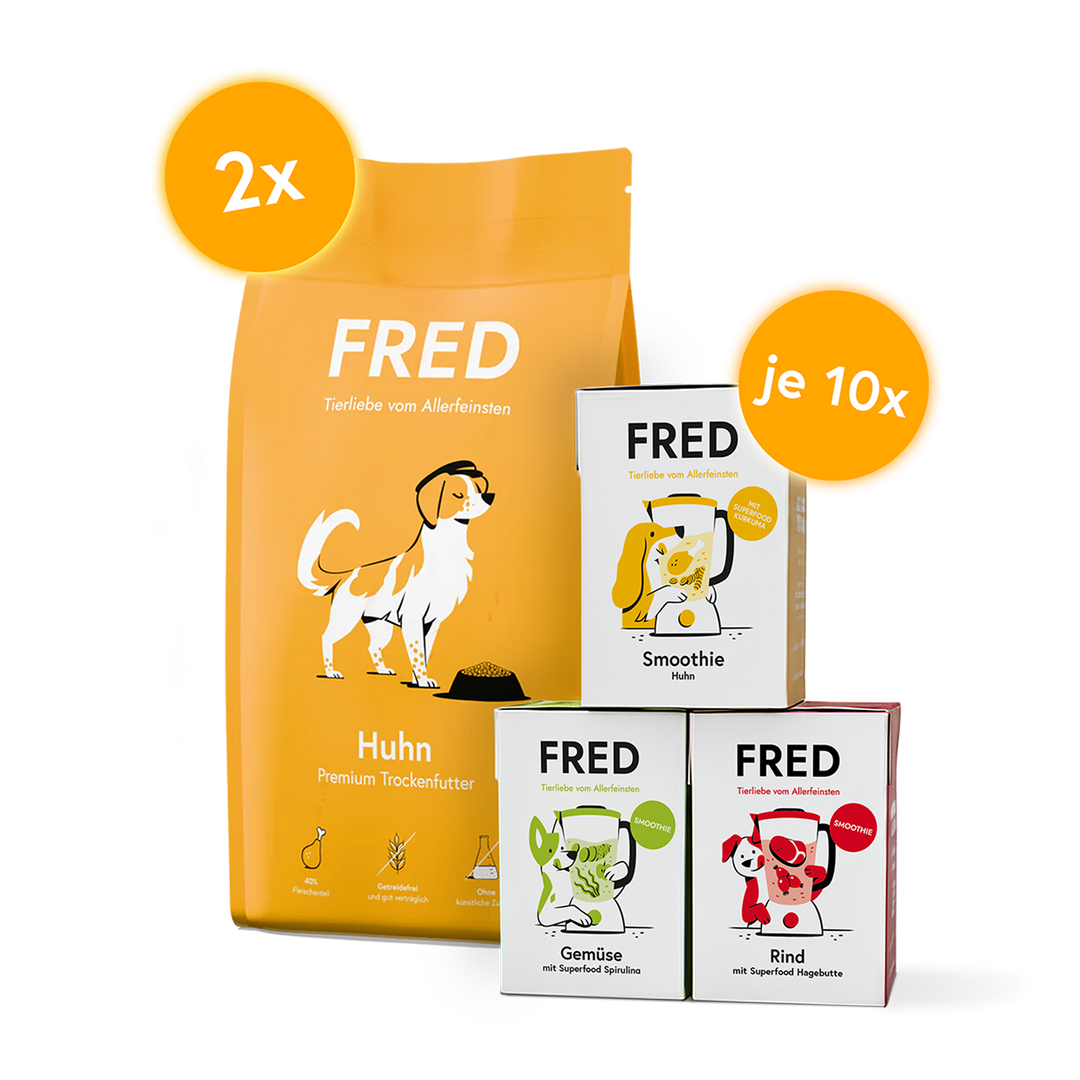 FRED Smoothie Rind mit Hagebutte, Huhn mit Kurkuma, Gemüse mit Spirulina