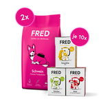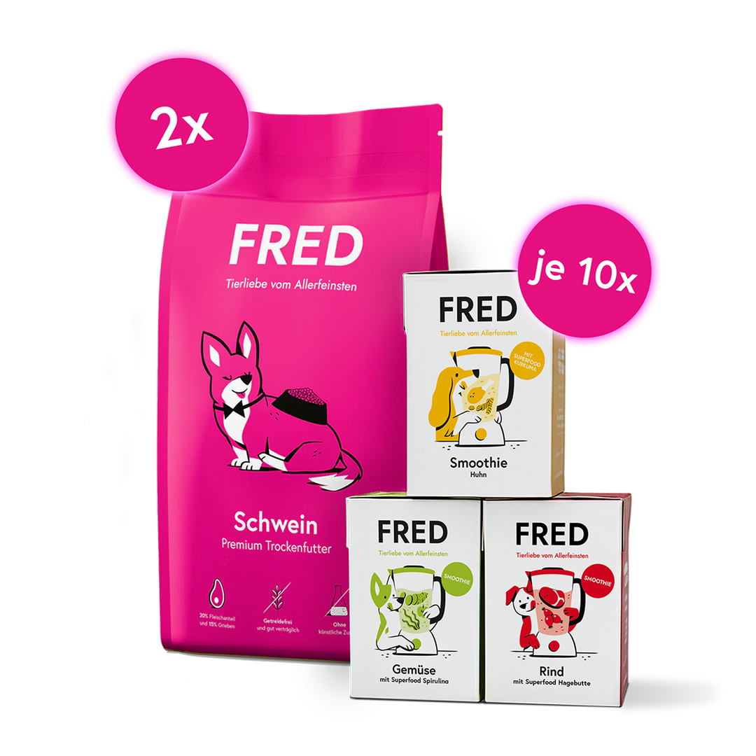 Das Bundle kombiniert unser hochwertiges FRED Premium Trockenfutter Schwein mit unseren Smoothies. Die Smoothies bringen frisches Fleisch, intensives Aroma und saftige Abwechslung in den Napf – ideal als Topping, Snack oder zum Mischen. Perfekt für alle Hunde, die Schwein lieben und extra Geschmack im Alltag genießen sollen.