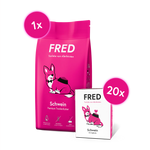 50% Schwein* (Muskelfleisch), Wasser* (18%), Spätzle* (9,5%), Zucchini* (9,5%), Karotten* (8,6%), Apfel* (2,7%), Flohsamenschalen*, Sonnenblumenöl*, Leinöl*, Mineralstoffe