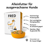 50% Huhn* (40% Muskelfleisch, 10% Herzen), Wasser* (19%), Reis* (9%), Süßkartoffeln* (8%), Erbsen* (4%), Pastinake*(4%), Apfel* (3%), Distelöl*, Leinöl*, Mineralstoffe