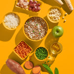 50% Huhn* (40% Muskelfleisch, 10% Herzen), Wasser* (19%), Reis*(8%), Süßkartoffeln* (8%), Erbsen* (4%), Pastinake* (4%), Apfel* (3%), Sonnenblumenöl* (1,1%), Lachsöl* (0,4%), Leinöl* (0,3%), Mineralstoffe