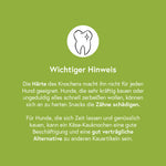 • Die Härte des Knochens macht ihn nicht für jeden Hund geeignet. Hunde, die sehr kräftig kauen oder ungeduldig alles schnell zerbeißen wollen, können sich an zu harten Snacks die Zähne schädigen.