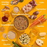 43% Huhn* (30% Muskelfleisch, 13% Herzen), Hühnerbrühe* (22,8%), Zuchini* (13,7%), Karotten* (11%), Quinoa* (4%), Apfel* (3%), Topinamburpulver (0,5%), Distelöl, Kurkuma (0,2%), Tomatenflocken, Grünlippmuschelfleischpulver (0,1%), Leinöl*, Lachsöl*, Mineralstoffe