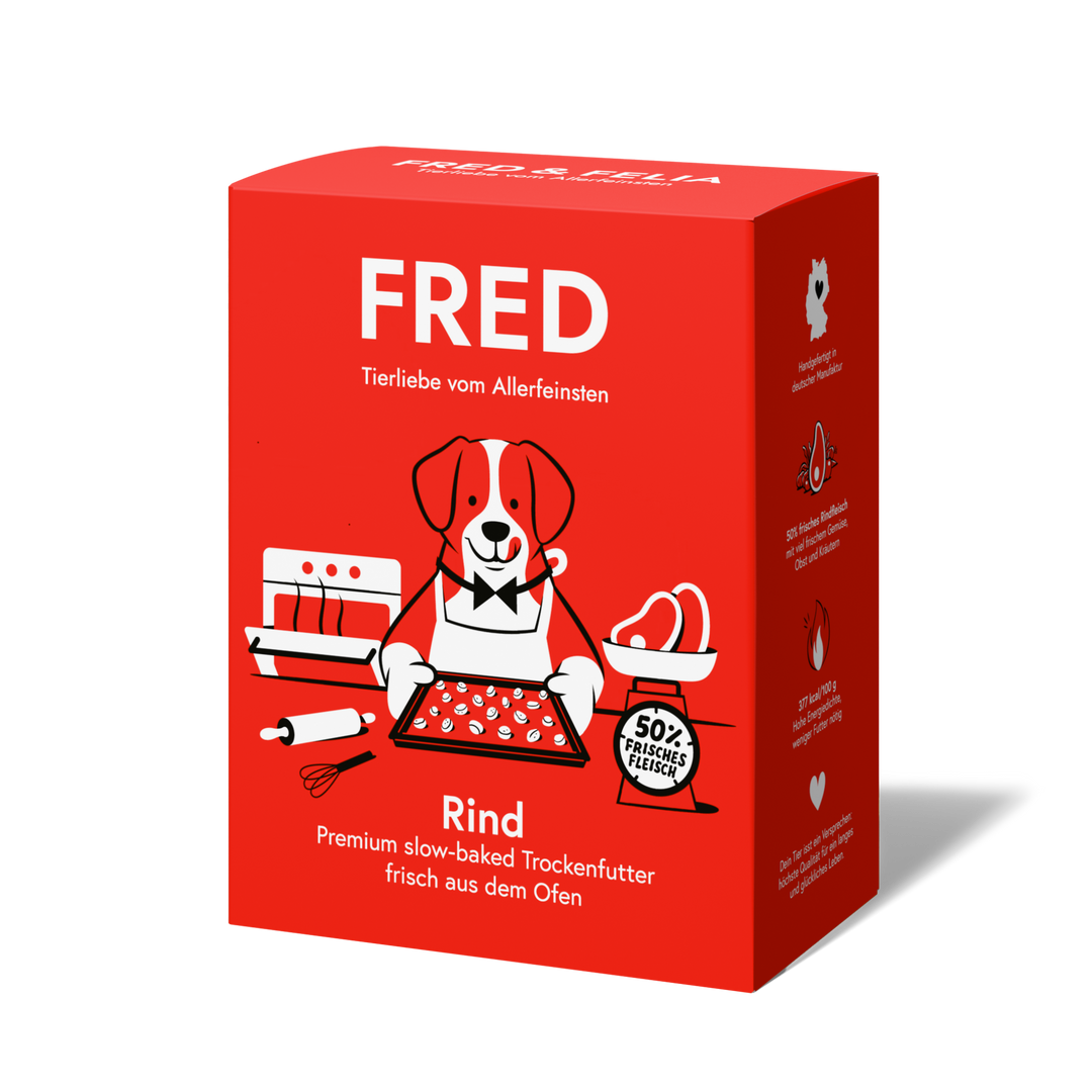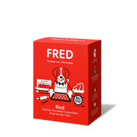 Mit 50 % frischem Rindfleisch und getreidefreien, leicht verdaulichen Zutaten wie Kartoffelflocken, Süßkartoffel, Lupinen und Kichererbsen ist FRED Rind ideal für ernährungssensible Hunde.